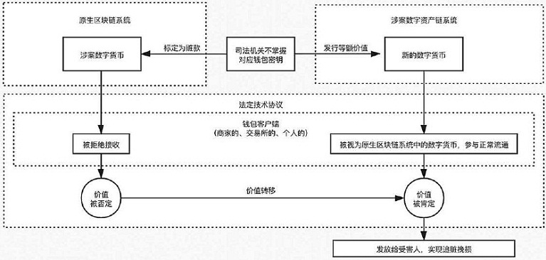 一方面,司法机关的“标定”带来了这笔数字资产在原生区块链系统中的价值否定,另一方面,也将带来在新系统中价值的肯定。司法机关可建立自主掌控的“涉案数字资产链”,将与原生系统中被否定价值等值的数字资产在该链中重新“发行”,赋予这些新的数字资产以价值,即通过法律规范和技术手段的结合,实现数字资产价值的“转移”,将它们分配发还给案件受害人,进而达到追赃挽损的目标。