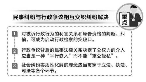 (三)民事纠纷与行政争议的一并化解。2014年修改的行政诉讼法增设了在行政诉讼中一并审理民事争议的制度,在涉及行政许可、登记、征收、征用和行政机关对民事争议所作裁决的行政诉讼中,当事人申请一并解决相关民事争议的,法院可以一并审理,有利于减轻当事人讼累,提高司法效率。这种社会纠纷实质性化解的理念应当贯穿于立法、执法、司法等各个环节。值得肯定的是,在行政检察过程中,检察机关以原告资格的认定事实不清、适用法律错误为由介入上述纠纷,体现出作为中立方的检察机关所肩负的法律监督职权。与此同时,鉴于当事人的核心诉求在于民事利益的保护和赔偿,通过促成民事和解的方式,可以有效推动民事纠纷与行政争议的一并化解。