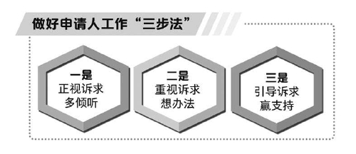 (三)坚持走进群众倾听疏导。行政争议之所以难化解,重要原因就是群众诉求表达渠道不畅,为此“畅通群众表达渠道,回应当事人诉求”就成为打开行政争议实质性化解大门的一把钥匙。“检例第120号”指导性案例中,可以挖掘出做好申请人工作的“三步法”:一是正视诉求多倾听。倾听是沟通的基础,而先处理情绪,再处理事情,则是沟通的高效方法。为此,办案人员应把注意力放在申请人的身上,让其充分诉说、不被打断,而不是聚焦在对错争论中。“检例第120号”指导性案例中,检察机关通过电话、视频、加入维权微信群等方式实现了双方的有效沟通,赢得了申请人的认同。二是重视诉求想办法。办案中不仅要倾听申请人诉求,更要重视诉求,着力解决问题。“检例第120号”指导性案例中,检察长亲自办案,分管副检察长带队“上门服务”听取意见,赢得了申请人的信任。三是引导诉求赢支持。涉众型案件争议化解难,难在“众口难调”,难在认知差异,难在诉求多种多样亦多变。为此,需要通过释法说理、诉求引导等方式,在解决问题的路径上赢得共识,避免“破窗效应”。“检例第120号”指导性案例中,检察机关在做足前两个环节工作的基础上,逐步引导申请人在聚焦上从“拆违者”转向“违建者”,赔偿上从不当期待转向合理诉求,态度上从对立转向对话,为后续行政争议实质性化解夯实了基础。