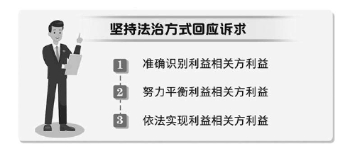 (五)坚持法治方式回应诉求。积极关注利益相关方的利益,寻求利益连接点,让相关方在合作中受益、受益中合作,依法回应各方诉求,是行政争议实质性化解的重要环节。以“检例第120号”指导性案例为例,共分“三个环节”。一是准确识别利益相关方利益。检察机关以“违建”为连接点,准确识别出文化公司作为“违建者”,诉求是由培训学校继续出资委托其进行房屋回购,消除与申请人多年积怨;申请人作为“购违者”,诉求是获得可期补偿;培训学校作为“违建”“回购者”,诉求是以可控支出解决涉案纠纷,推进项目落地;镇政府作为“拆违者”,诉求是消除“拆违”遗留隐患,维护区域稳定。二是努力平衡利益相关方利益。”检例第120号”指导性案例中,各方利益能否实现,取决于培训学校的“可控支出”与申请人的“可期补偿”能否平衡。为此,检察机关把实现双方的利益平衡,同时避免已退房人员的失衡,作为推动一揽子矛盾化解的抓手,最终达成了和解方案。三是依法实现利益相关方利益。基于民事法律关系的相对性,首先,由培训学校向文化公司支付回购资金;其次,由文化公司向申请人承担“违建”责任,签订和解协议;最后,由申请人撤回行政诉讼监督申请,实现案结事了政和。