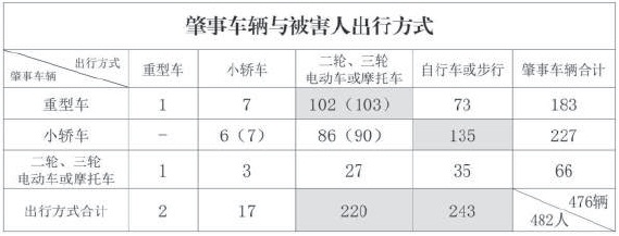 从被害人情形看,行人和非封闭交通工具驾乘人在发生交通事故时死亡率高。482名被害人中,骑自行车和行人最多,共243人,占50.4%;其次是驾乘二轮、三轮电动车或摩托车,共220人,占45.6%。其中,小轿车撞击自行车或行人致死人数最多,有135人,其次是重型车撞击二轮、三轮电动车或摩托车致死103人。