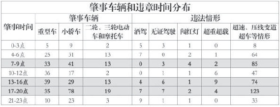肇事车辆以小轿车为主,违章情形以超速、压线变道超车居多。肇事车辆中,小轿车有227辆,重型车有183辆,两者占比86.3%,其中小轿车肇事时间集中在晚高峰和早高峰,重型车肇事时间集中在13点至16点。违章情形中,超速、压线变道超车等轻微违法最多,占各时间段首位;酒驾集中在凌晨4点至6点和深夜21点至23点;无证驾驶集中在下午和晚上;闯红灯集中在早高峰;超重超载集中在13点至16点。